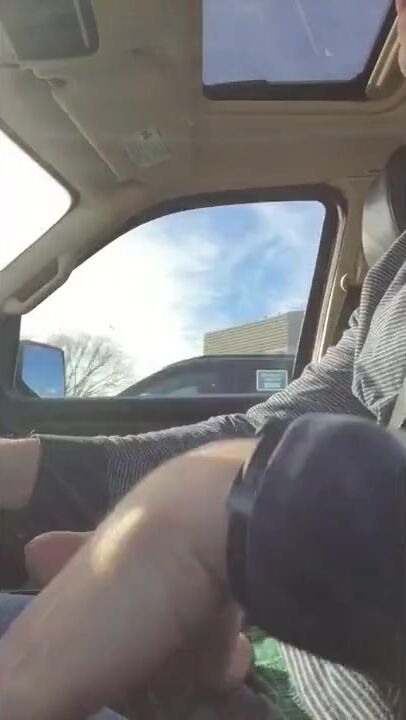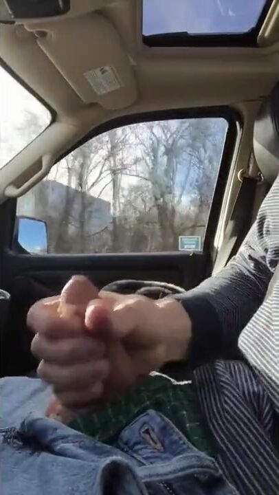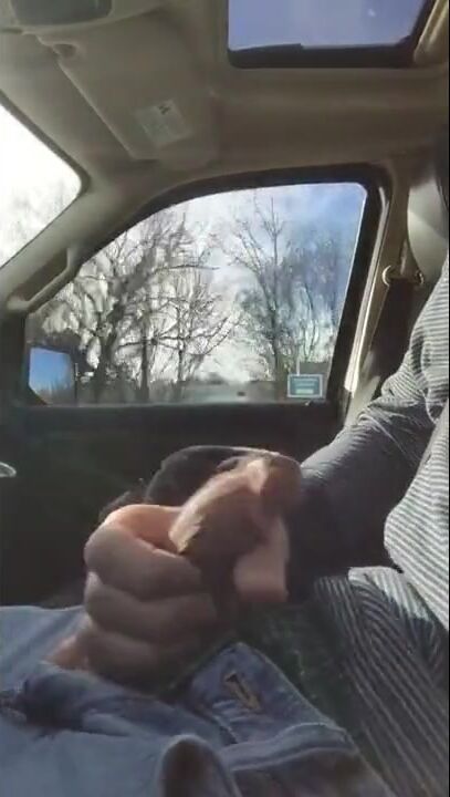 Jerking off and cumming while driving on highway. Pass several trucks and a tour bus full of people.