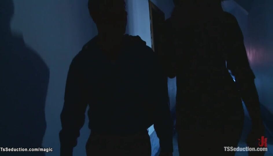 Tall Brunette Shemale Fucks Handcuffed Man