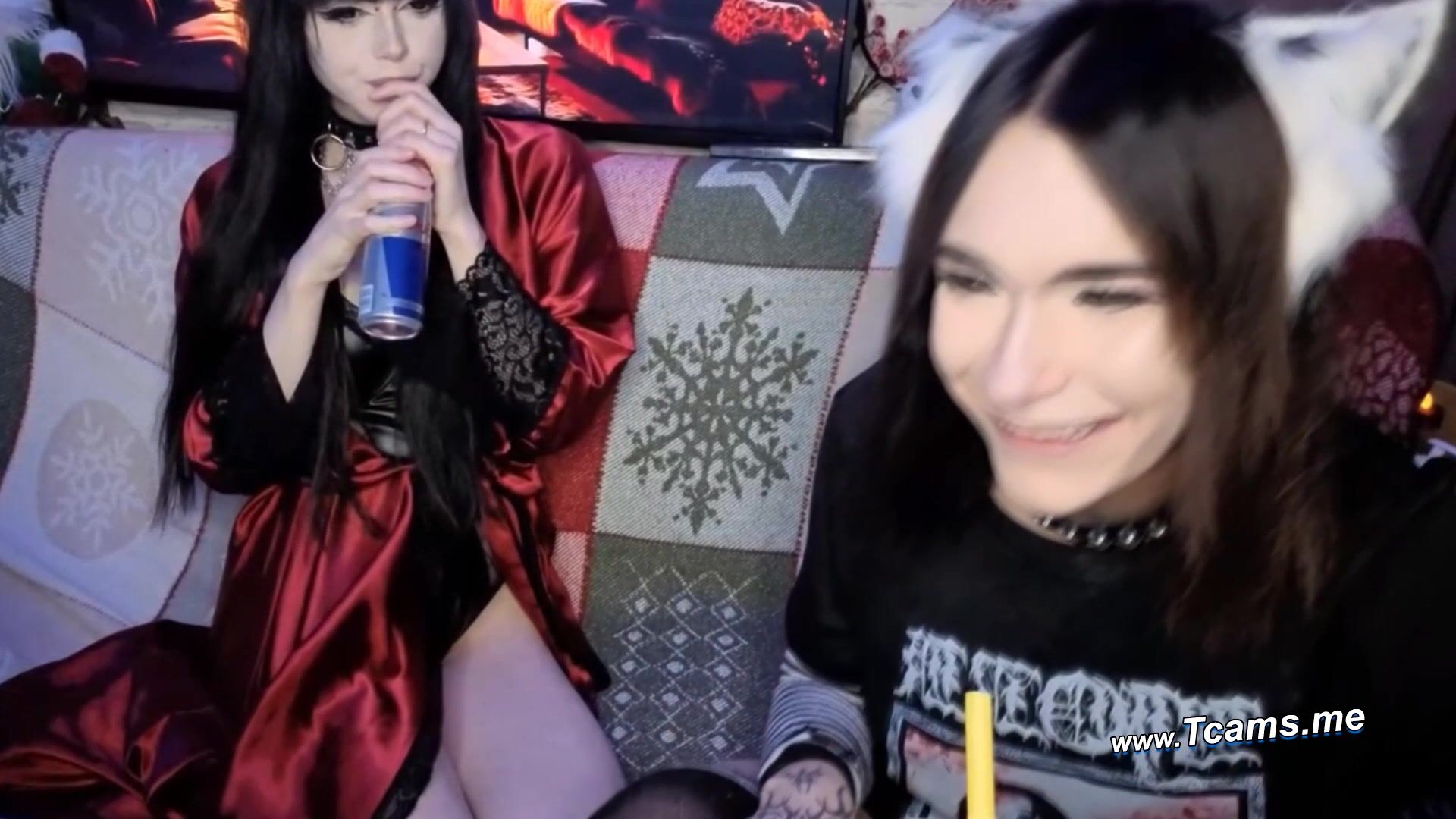 In a cozy room lit by a TV screen, a stunning babe in a shiny red satin dress lounges seductively on a patterned couch next to a gorgeous transwoman in a black metal band T-shirt and striped sleeves, accessorized with a choker. The transwoman playfully points at the camera while the babe leans in close, their long dark hair cascading. This captivating duo performs on a live webcam show via tcams.me, teasing viewers with intimate moments. Later, the transwoman reveals her feet for playful interaction, as the babe toys with them sensually, building to an erotic climax where she eagerly licks and rims the transwoman's ass