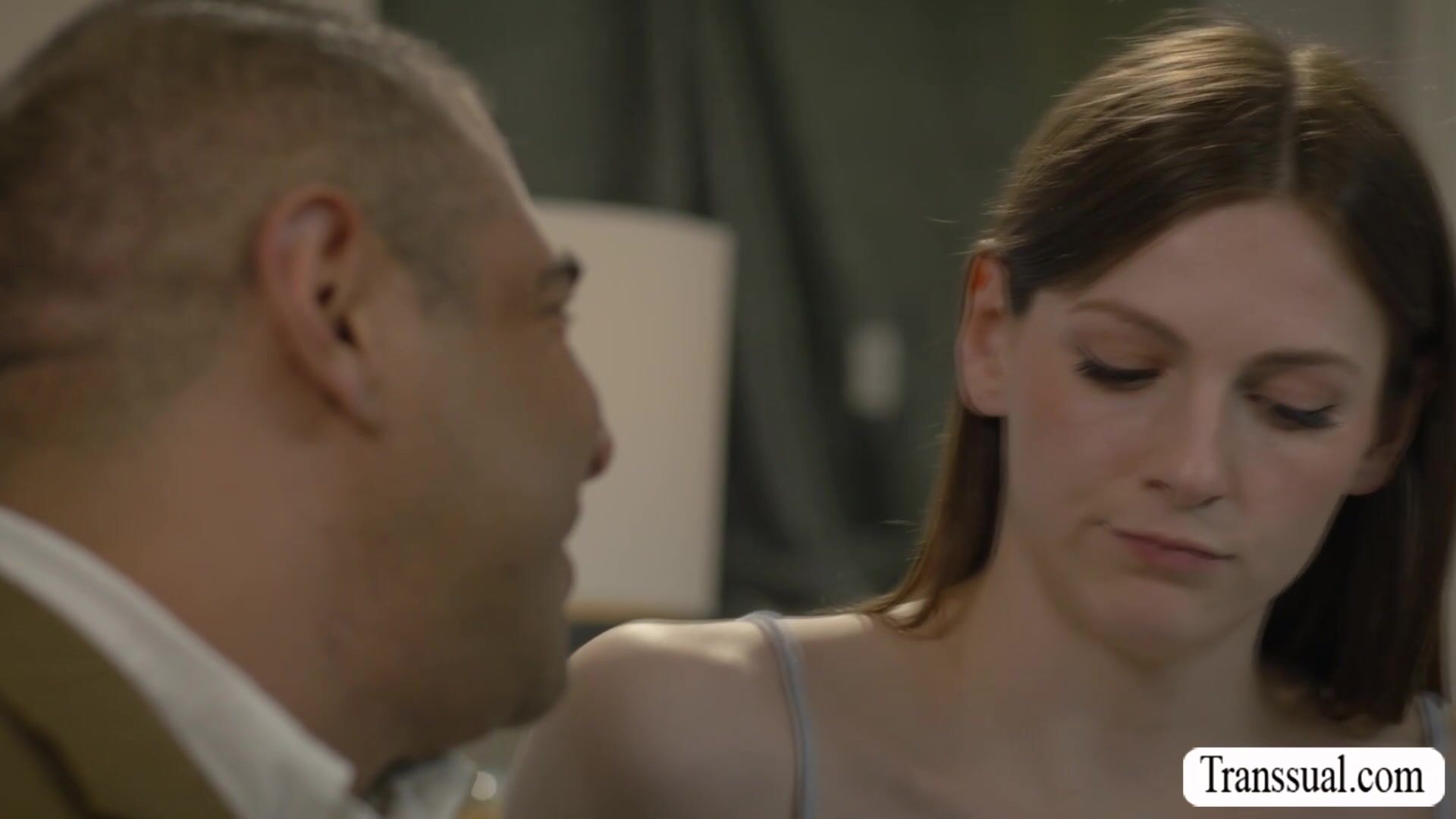 Stunning TS femboy with flowing red hair and rock-hard cock starts in lingerie, teasing the tattooed muscular stud in a suit. Soon clothes fly off for intense oral worship, deep kissing and savage fucking in missionary and doggy. Check out Transsual.com and get a discount!