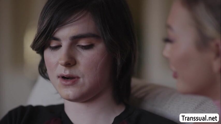 Brunette and pale petite tranny Ella Hollywood confess and fucks babe Adira Allures pussy on the couch.