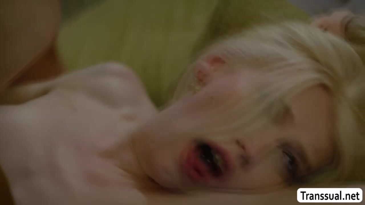 Shemale blonde goes to the room of her stepbro and seduces him to have sex with her.Stepbro locks his door and they start kissing each other.After that,smalltits TS throats the big cock of stepbro and lets him bareback her wet ass after.