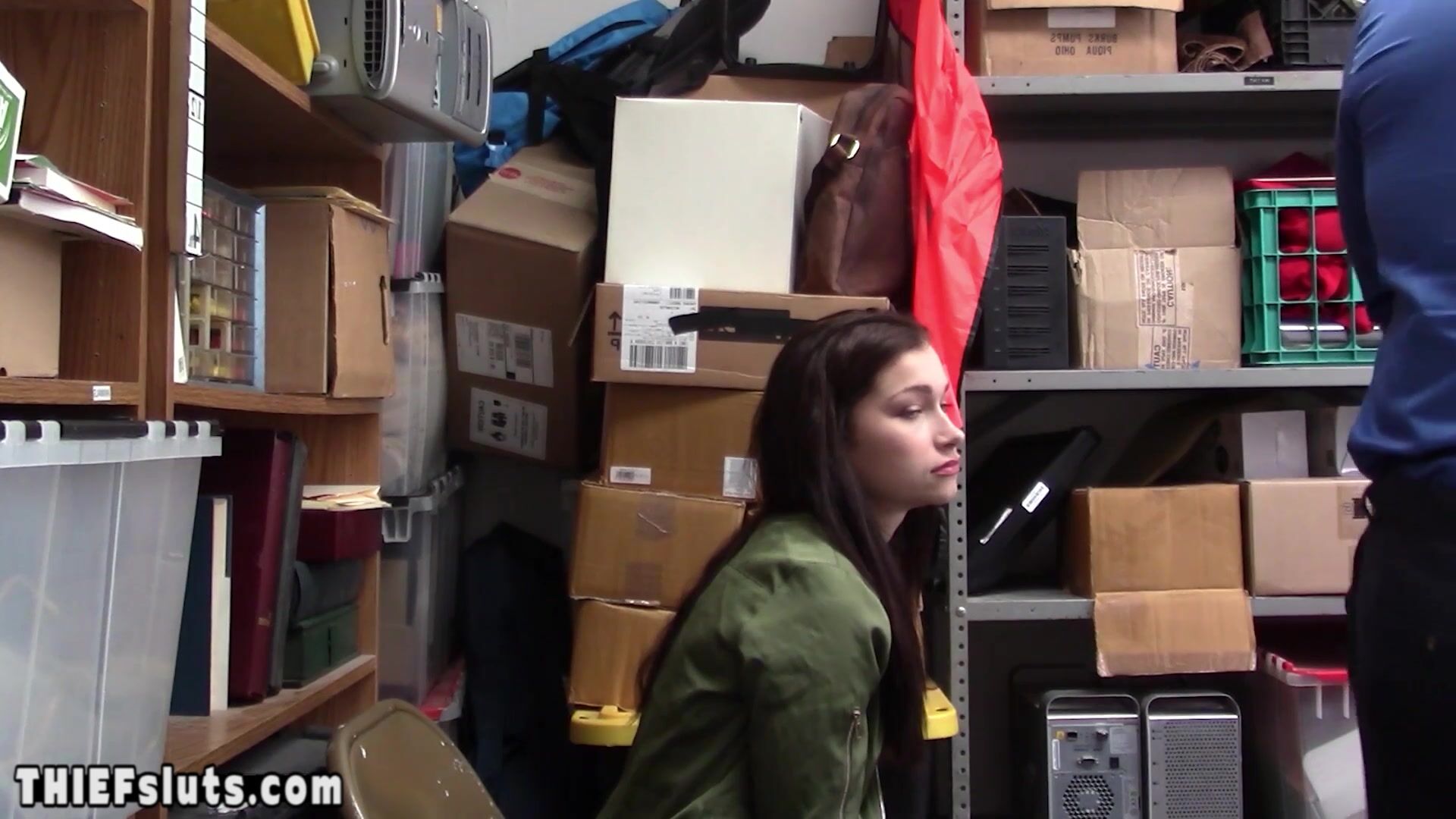 Petite brunette teen shoplifter Jennifer Jacobs with big tits interrogated by a dirty LP officer who ordered her to suck his big cock then he fucked her shaved pussy to teach her a lesson